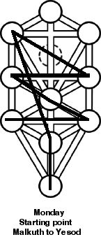 An interesting aspect to add if you have an inclination towards sacred geometry and sigils is to start each day with a small picture of the Tree that is simple in terms of no additional labeling, etc. As you start each day’s mini walk, beginning in the sphere of Malkuth, draw a line connecting the first sphere for that particular day (remember that will change over the 7 days since each day begins with a different ruling planet and thus a different sphere). Continue to draw a connecting line from each sphere as you move to the next until you have gone through all seven for the day. Use a colored pencil or highlighter to retrace the pattern. Some very interesting sigil type geometry is revealed which could serve as mental triggers at a later time.