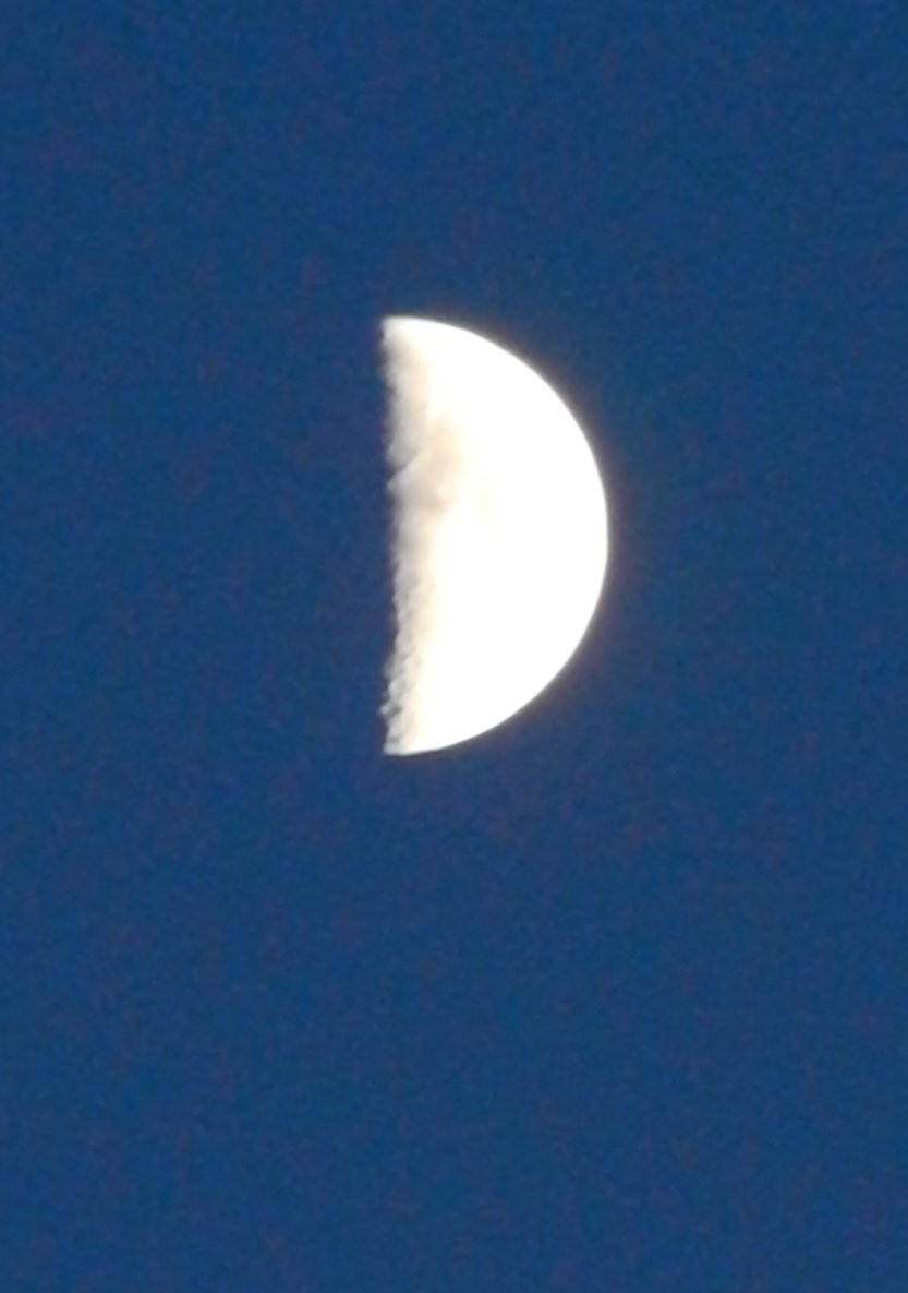 Out shooting (camera pics) with my husband tonight and we stopped to catch the sunset. I wanted to post this picture of the First Quarter Moon as a side note to the postings on Temple of the Moon. Going out and seeing the moon perfectly poised and balanced in the midst of a darkening blue sky was the icing on the cake for Day Eight’s posting about balance and refining.