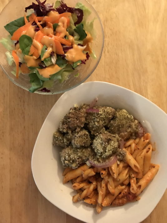 -Lamb meatballs and penne in a wine rose tomato gravy-