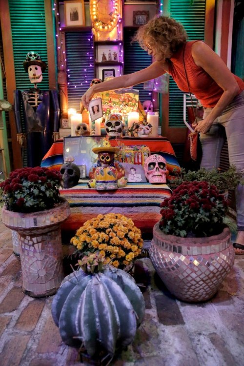 Linda Stone, co-owner of the restaurant, positions photos on the alter at the Day of the Dead celebration held Tuesday, Nov. 1, 2016, at Casa Borrega. (Dinah Rogers Photo)